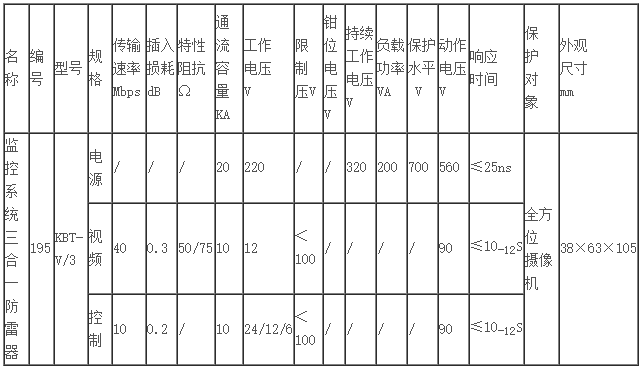 KBT-V3三合一防雷器根據(jù)監(jiān)控系統(tǒng)的特點量身打造的專用防雷設(shè)備,它集電源防雷器、視頻線路防雷器和控制線路防雷器于一體,各部分均采用多級串聯(lián)式結(jié)構(gòu)設(shè)計,具有多級保護功能。適用于公共場所、各種樓宇、機場、海關(guān)、軍事基地等各種重要安防設(shè)施的室內(nèi)、室外監(jiān)控攝像槍的防雷擊電磁脈沖保護。三合一防雷器用于帶云臺攝像槍,安裝在監(jiān)控系統(tǒng)前端的攝像機尾部,位置與攝像機越近越好,并做好接地處理,接地電阻應(yīng)符合標(biāo)準(zhǔn)的要求。